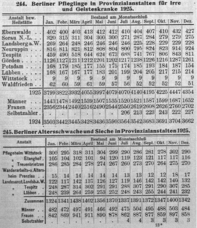 Es ist anzunehmen, dass auch die jüdischen Patient*innen in der Klinik nach der Machtergreifung der Nazis 1933 nicht unbehelligt blieben, aber spätestens mit Kriegsbeginn wurde Walter Blonck vermutlich in das Pflegeheim nach Wittstock (Dosse) verlegt, einer der Provinzialanstalten für Irre und Geisteskranke aus Berlin (Bild 3) (6). Wie man der Tabelle entnehmen kann, waren im Jahr 1925 etwa 5000 Pfleglinge, Alte und Kranke (Sieche) in Anstalten in Berlin untergebracht, und etwa die gleiche Anzahl in Anstalten außerhalb Berlins, davon etwa 300 in Wittstock. Hier verliert sich wieder die Spur von Walter Blonck, Krankenakten werden regelhaft nur 30 Jahre aufbewahrt.