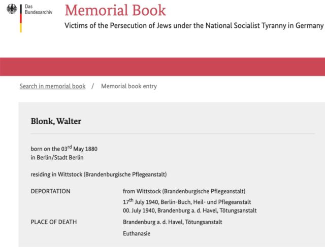 Es fand sich dann doch noch ein weiterer Hinweis auf seinen Verbleib im Gedenkbuch des Bundesarchivs zu den Opfern des Nationalsozialismus (7). Danach wurde der Patient „Walter Blonk“ im Rahmen der sogenannten T4-Sonderaktion von Wittstock nach Berlin-Buch in die dortigen Heilanstalten verlegt. In Buch wurden die psychiatrischen Patienten aus den umliegenden Anstalten gesammelt und dann nach Brandenburg (Havel) deportiert, wo sie direkt nach Ankunft ermordet (vergast) wurden; für Walter Blonck ist der 17. Juli 1940 als Tag der Deportation und Ermordung festgestellt (Bild 4).