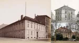 Das erste Leben erhielt das Haus mit seiner Erbauung als „Maison d’Orange“ durch die Hugenotten aus der französischen Provinz Orange im Jahr 1883. Das Maison d’Orange hatte zunächst ab 1705 an der Dorotheenstraße 26 residiert, in einem mit englischen Spendengeldern gekauften Haus aus der barocken Frühbebauung der Dorotheenstadt. 1794 war das Haus komplett neu gebaut worden (Bild 2 links), und noch bis 1883 Heimat für die aus Orange vertriebenen „Refugiés“; wenngleich natürlich nicht alle hier lebten, es waren schließlich mehrere Hundert nach Berlin gekommen. Hier wohnten vor allem Witwen und wenig bemittelte Personen. Im Jahr 1883 verkaufte die Gemeinde das Grundstück für fast eine halbe Million Reichstaler (Immobilien im Innenstadtbereich waren wertvoll geworden) und kaufte stattdessen für 25.000 Taler eine Parzelle im Kielgan’schen Villenareal, Ulmenstraße 4 (s. mittendran vom 6.4.2021) und ließ dort ein neues Wohnhaus bauen (Bild 2 rechts oben) (1).