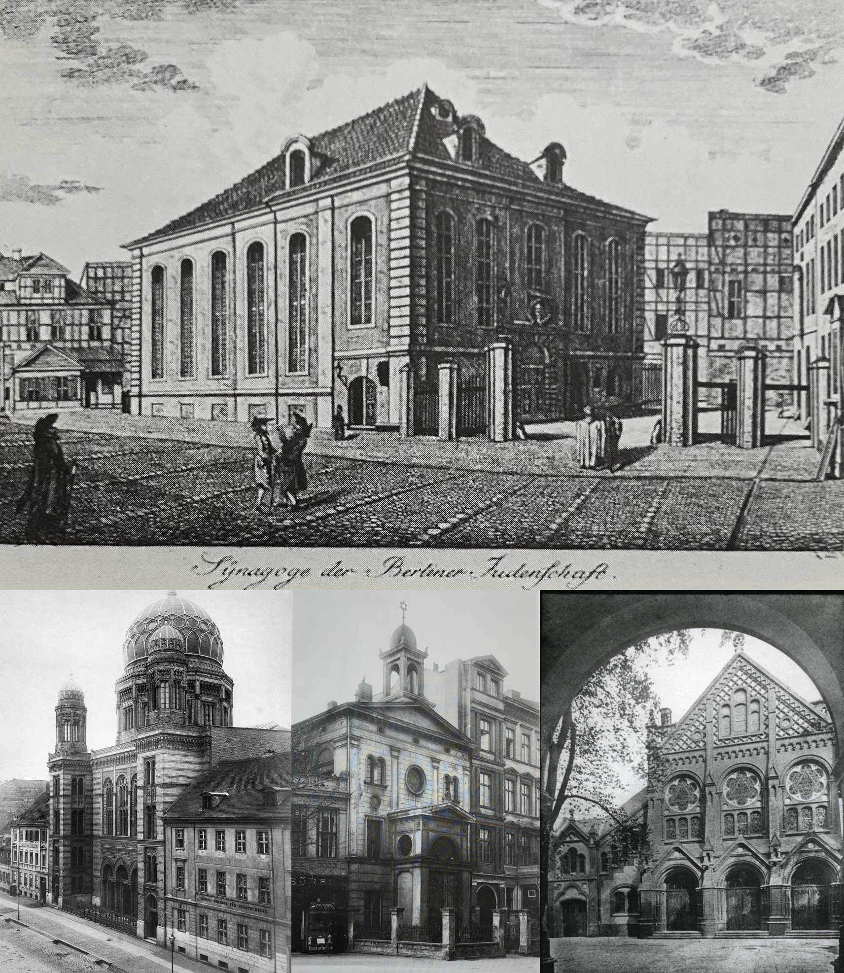 Bild 3: Bild der Alten Synagoge von 1714 (oben), der neuen Synagoge in der Oranienburger Straße von 1865 (unten links), der Synagoge am Schöneberger Ufer 26 von 1875 (unten Mitte) und der Synagoge in der Lützowstraße 16 von 1898 (unten rechts) (alle Bilder gemeinfrei).