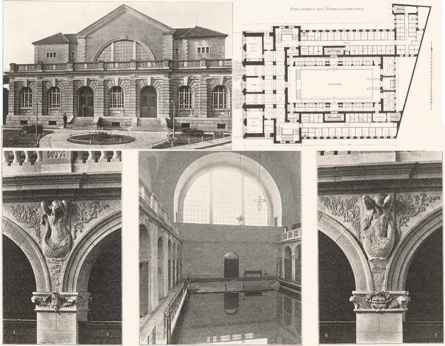 Bilder des Bades in der Dennewitzstraße, aus: Ludwig Hoffmann 1902 (Quelle: Webseite des Architekturmuseums der Technischen Universität Berlin in der Universitätsbibliothek, https://architekturmuseum.ub.tu-berlin.de/index.php?p=51&SID=16048248459821)
