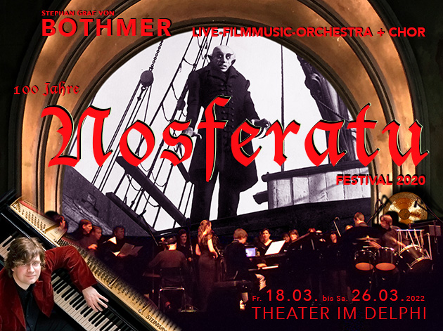 NOSFERATU wird von Stephan Graf v. Bothmers Berliner Live-Filmmusic-Orchestra + Chor interpretiert. Bothmers Musik ist packend und extrem suggestiv: statt den Film zu überladen, schlüpft sie quasi in den Film hinein, lässt Archetypen lebendig werden und nimmt das Publikum mit. Es erlebt den Film von innen heraus!