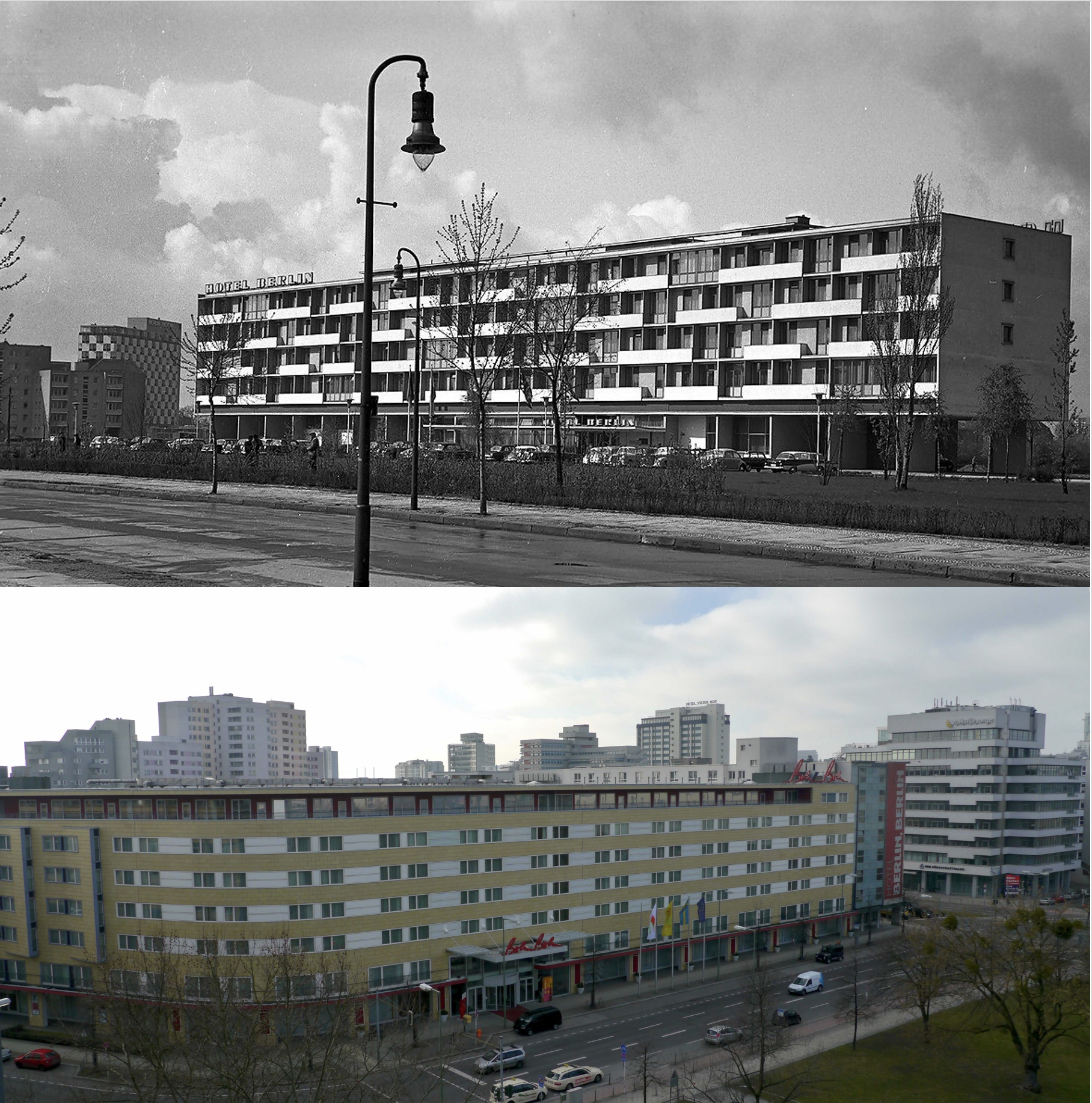 Das Hotel Berlin, Berlin im Jahr 1960 (Eingang an der Südseite) und im Jahr 2010 (Eingang an der Nordseite (Quelle: Wikipedia, gemeinfrei).