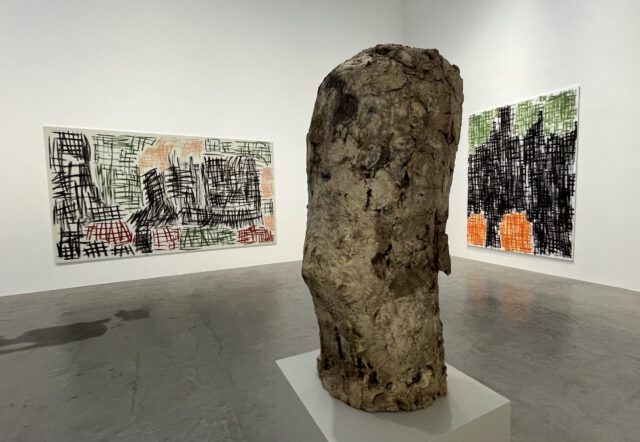 Bei Max Hetzler begeben sich grobe Skulpturen von Hans Josephson (1920-2012), die – nur in der Gestalt, nicht in der Oberfläche – an Menschen gemahnen, in einen Dialog mit großformatigen Gitter-Bildern von Günther Förg (1952-2013), einen Dialog, den die beiden Künstler in ihrer Lebenszeit nur selten realisiert hatten.