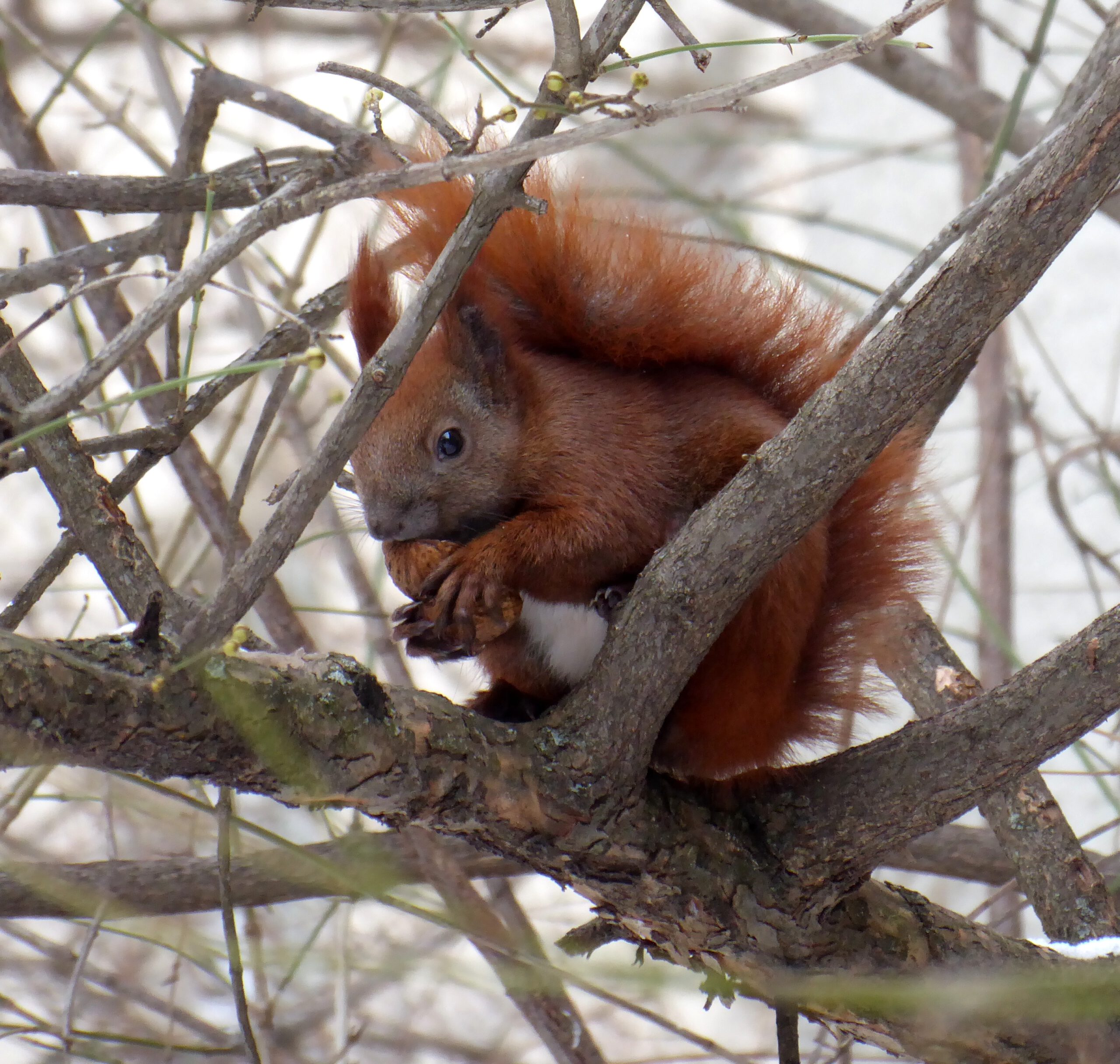 Als ich weitergehe begleitet mich ein paar Schritte meines Weges ein Eichhörnchen, bevor es mit seiner Nuss oben auf dem Baum verschwindet.