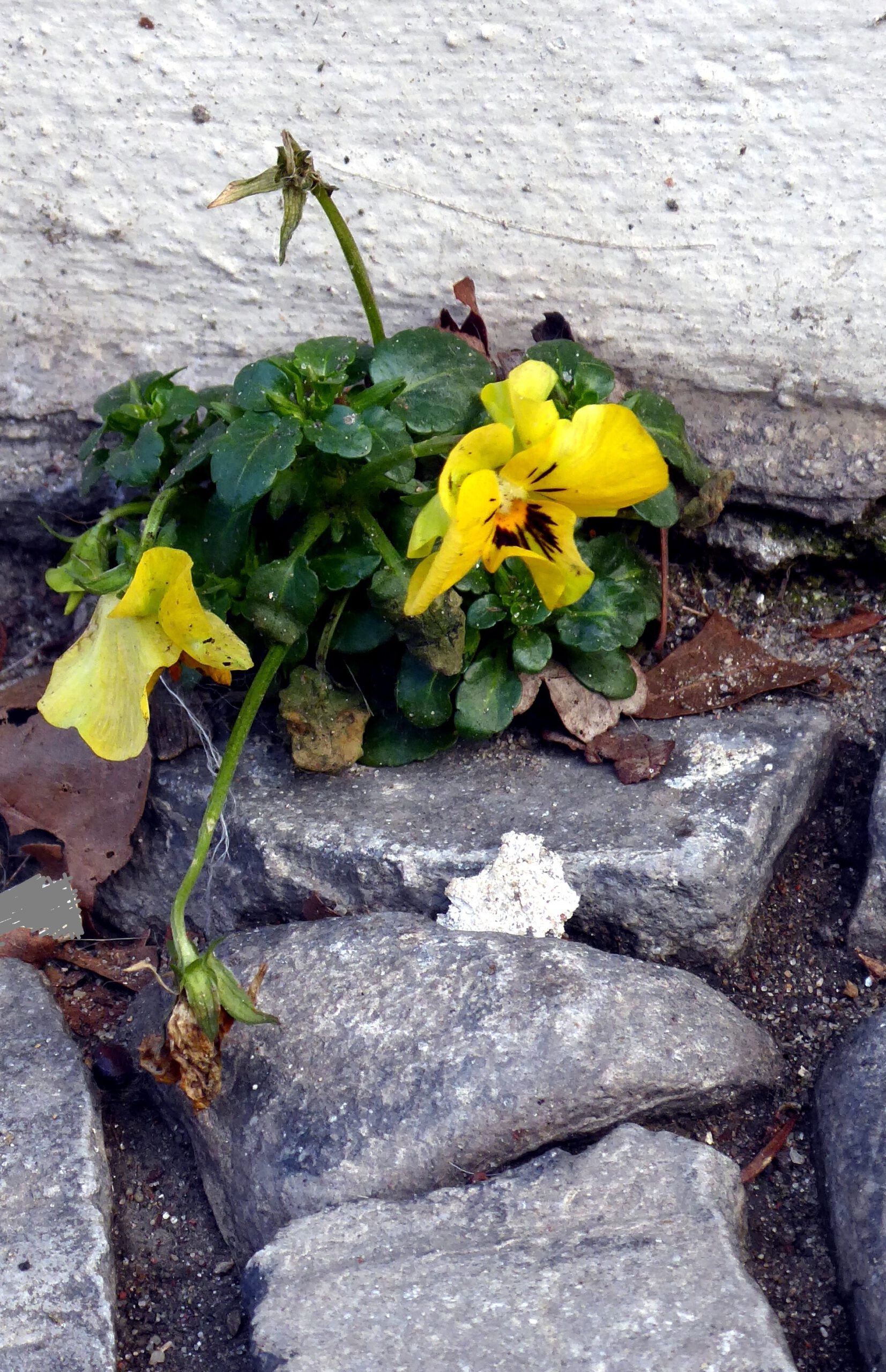In der Kluckstraße, am Magdeburger Platz, leuchtet schüchtern zwischen grauen Pflastersteinen vor einer Hauswand gelb die Blüte eines kleinen Hornveilchens.