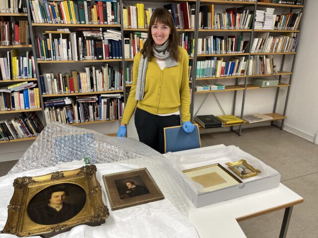 Recherchen wie die zur Familie Popper vom Lützowplatz entwickeln oft eine eigene Dynamik, die manchmal weit weg führen vom Lützow-Viertel: Nach Hildesheim, Hannover und Dessau war diesmal Düsseldorf Ziel der Reise. Das Heine-Porträt, das wir vor einiger Zeit im Deutschen Museum in Berlin gefunden hatten, das 1871 nach einem Gemälde von Isidor Popper (1816-1884) von dem Lithografen Ferdinand Neubürger (1835-1911) aus Dessau geschaffen worden war (mittendran vom 11. September 2025) und das lange Zeit am Lützowplatz 2 residierte, war Anlass, einen Besuch im Heinrich-Heine-Institut in Düsseldorf zu planen, um neben dem Original – der Vorlage für die Lithografie – auch einige der übrigen dort gesammelten Heine-Porträts zu besichtigen (1). Es hat sich gelohnt, wie ich finde. Das Institut in der Düsseldorfer Altstadt (Bilker Straße 12-14) befand sich zwar im Umbau, aber die zuständige Literaturhistorikerin Nora Schön war so freundlich, einige der Schätze des Archivs hervorzuholen (Bild 1), darunter das Popper-Gemälde. Und der für Nachlässe und Sammlungen, aber auch für das Heinrich-Heine-Jahrbuch zuständige Archivar, Martin Willems, war so freundlich, die immer noch wachsende Geschichte des Heine-Gemäldes von Isidor Popper für das Heine-Jahrbuch 2026 einzuplanen – und für einen Vortrag im Rahmen der der Düsseldorfer Provenienz-Tage im April nächsten Jahres. Wir werden darüber berichten.