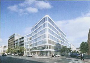 In der Bülowstraße 80, Ecke Steinmetzstraße ist ein städtebaulicher Wildwuchs, kaum nachzuvollziehen, dass ein Bauamt so etwas genehmigt hat. Jetzt entsteht dort ein Bau, der die gesamte Baulücke in der Steinmetzstraße schließt und damit die Blockrandbebauung wieder vervollständigt. Von der Traufhöhe am Altbau bis zur Ecke wird der transparente Glasbau auf sieben Stockwerke mit 26 Meter nach oben gestaffelt und mit einer großen gerundeten Ecke, die rund drei Meter über der Straße schwebt und in einem eleganten Bogen in die Bülowstraße führt, abgeschlossen. Die Fassade wird von Loggien durchbrochen, es gibt mehrere Terrassen und der Innenhof wird begrünt. Eine Tiefgarage ist für 35 PKWs mit fünf Ladestationen und 55 Fahrradstellplätzen vorgesehen.
