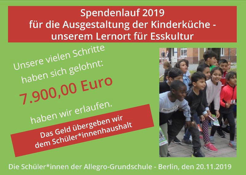 | … und umso mehr freuen wir uns, dass beim Spendenlauf, den die IG Potsdamer Straße bereits zum dritten Mal durch Organisation, Umsetzung und Mitlaufen unterstützte, so viel Geld für den Lernort für Esskultur in der Allegro-Grundschule (der Förderverein ist IGP-Mitglied) erlaufen wurde.