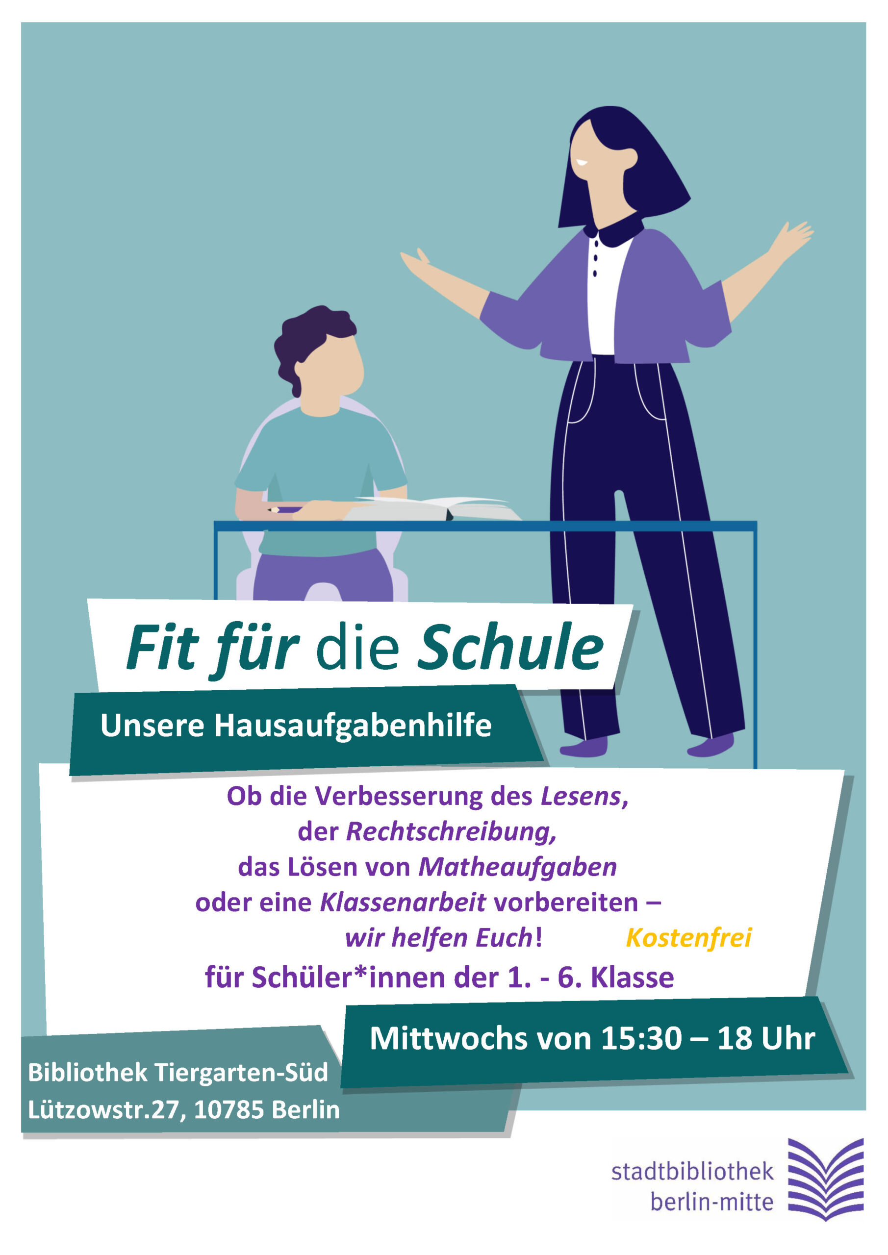 Die Stadtbibliothek in der Lützowstr. 27 bietet ab sofort wieder Hausaufgabenhilfe für Schülerinnen und Schüler der Klassen 1 – 6 an. Die Hilfe beim Lesenlernen, in Rechtschreibung und Mathematik gibt es immer mittwochs von 15:30-18:00 Uhr kostenfrei in der Bibliothek.