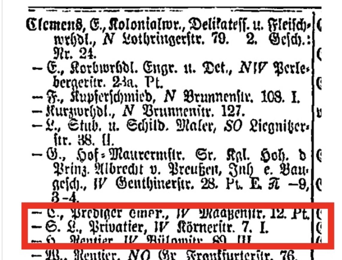 Mark Twain hat in einer amüsanten Geschichte beschrieben, wie ihm ein Makler die Gegend als bevorzugte Wohnlage des deutschen Adels versucht hatte zu vermitteln und ihm andere Wohnungen madig machte: „Einige lagen an der großen und prächtigen Potsdamer Straße, andere am Ufer eines hübschen Kanals mit schattigen Bäumen und schöner Aussicht auf das wogende Wasser und Brücke“ – klingt sehr nach Schöneberger oder Lützowufer (3). Was aber erstaunt – Twain wäre sicherlich begeistert gewesen, hätte er es erfahren –, ist, dass diese drei Monate ausgereicht haben, ihn im Berliner Adressbuch des Jahres 1892 unter seinem bürgerlichen Namen „S. L. Clemens, Privatier, W., Körnerstr. 7, I“ zu verewigen (Bild 1).