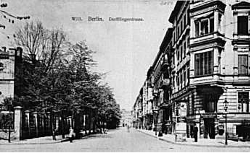Die Derfflingerstraße hatte immer schon diese zwei sehr unterschiedliche Seiten, eine idyllische auf der rechten Seite, von der Lützowstraße kommend (nur 12 Häuser, die Nr. 1 bis 12), und eine geschäftige links (28 Häuser, die Nr. 13 bis 30) (s. Bild 1) – der gilt diese Geschichte, die Idylle kommt dann ein andermal. Drei Mietshäuser fallen auf: die Nr. 14 und die Nr. 21, die auch im Verzeichnis der unter Denkmalschutz stehenden Häuser von Berlin enthalten sind, und die Nr. 19a, die seit 1907 der französischen Kolonie gehörte (Hotel de Refuge).