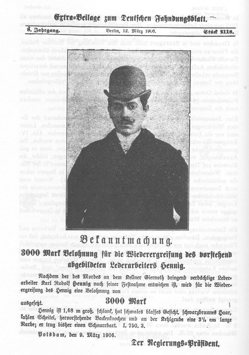 Die Geschichte wurde nicht nur 1906 verfilmt – Hennig (Bild 2) hatte noch versucht, seine Geschichte für 1700 RM an den Berliner Lokalanzeiger zu verkaufen. Der wahre Ablauf des Mordes ist gut recherchiert (2), wird aber heute vor allem deswegen diskutiert, weil bei der Verfilmung die Anfänge der Filmzensur durch die Polizei sichtbar wurden.