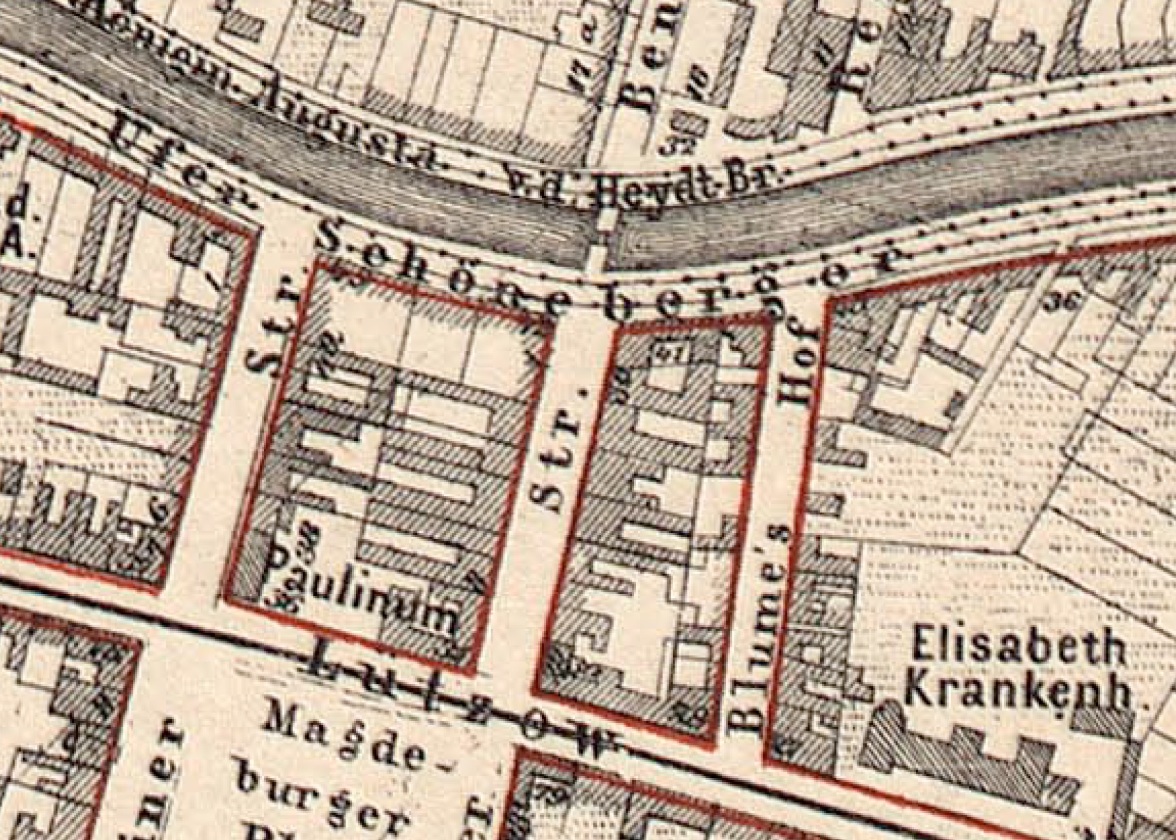 Bild 1: Die Lage des Paulinums an der Lützowstraße zwischen Genthiner und Magdeburger Straße auf einer Karte von 1882 (Ausschnitt aus: https://digital.zlb.de/viewer/image/15453195/1/)