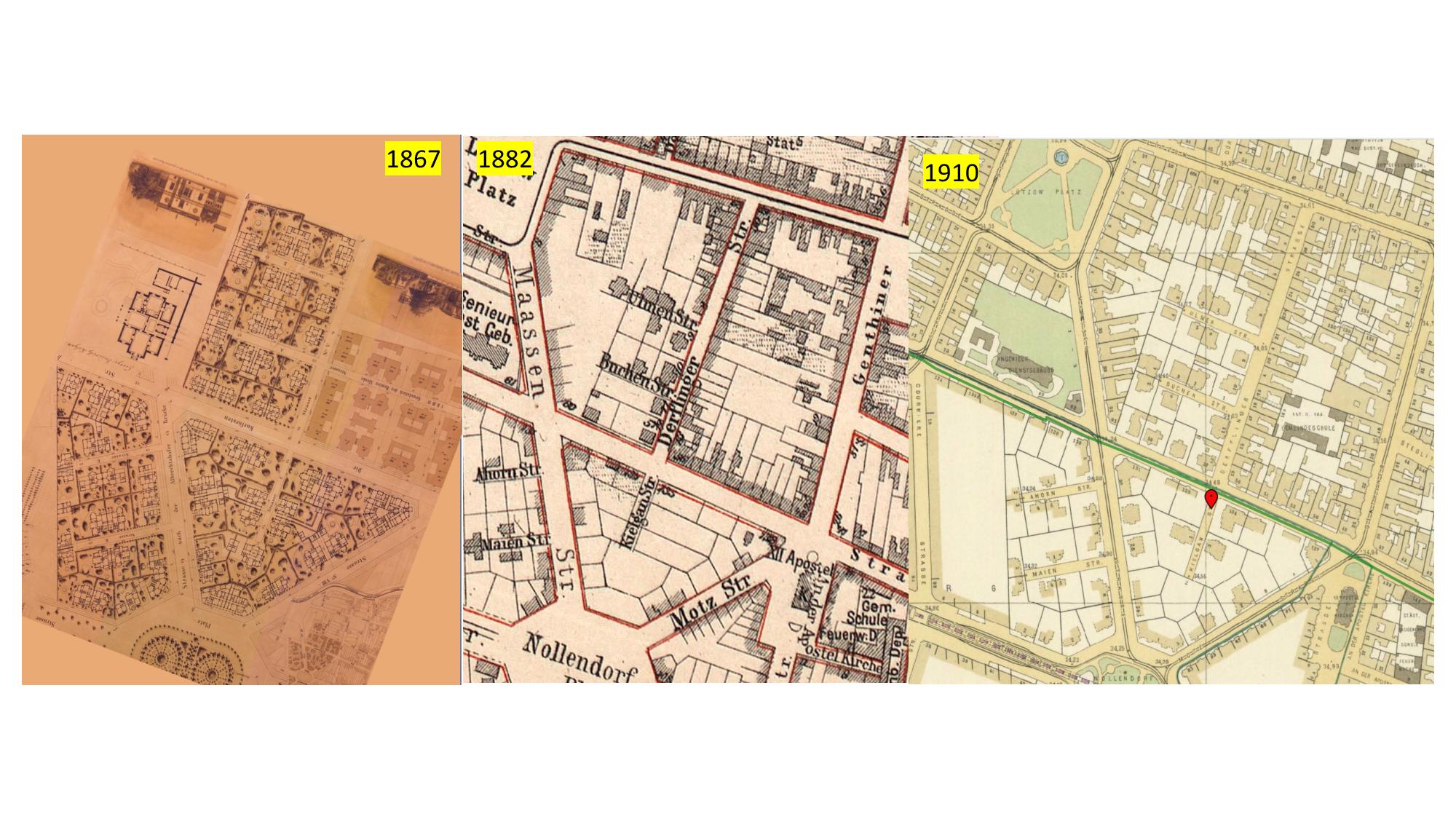 Schließlich: Ein Stadtplan von 1882 zeigt ein kaum verändertes Bild: Die Buchen-, Ulmen- und Maienstraße scheinen bebaut und bewohnt, die Ahornstraße und das Dreieck jedoch nicht, bis auf einige Gebäude entlang der Kurfürstenstraße (Bild 2, Mitte); Kielgan selbst wohnte ebenfalls an der Kurfürstenstraße, Nr. 136 und 137, wo später (ab 1923 und bis 1945) die polnische Botschaft war, heute steht dort das neue Appartementhaus. Im Jahr 1910 (Bild 2, rechts) sind auch die restlichen Grundstücke bebaut, aber nicht alle Hausgrundrisse haben den ursprüngliche geplanten Villencharakter, manche sind erheblich kleiner, als hätte das Geld nicht für mehr gereicht. Da im 2. Weltkrieg viele der Häuser zerstört wurden, lässt sich dies heute jedoch nur schwer beurteilen.