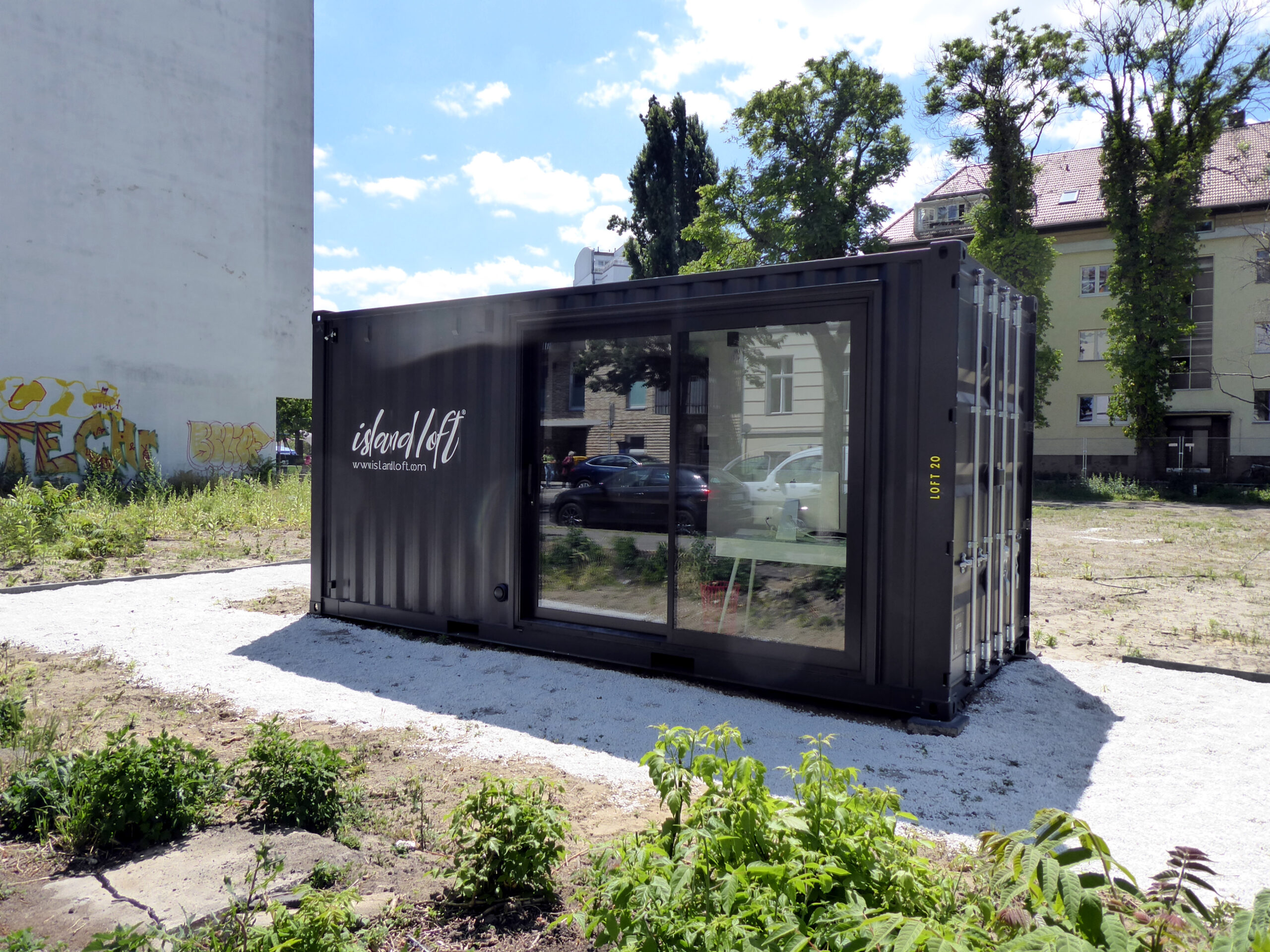 Auf dem Grundstück Kurfürstenstraße 134/Ecke Kilganstraße ist ein vorgefertigtes „All In Container Haus“ der Firma „islandloft.com“, das „Loft20, aufgestellt worden. Das aus einem neuwertigen Container gefertigte Tiny House hat eine Innenfläche von 11,2m2 (14,8m2 Grundfläche), außen ist es mit „Islandloft Dark Grey“-Lack bestrichen. Es kann zum Wohnen oder als Büro (wie das hier aufgestellte Modell) genutzt werden.