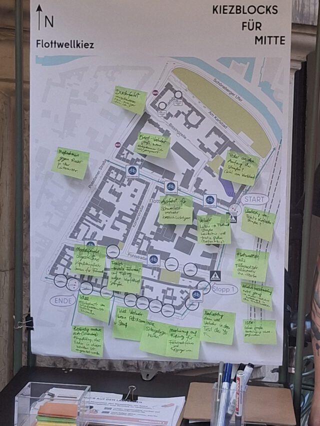 Der Bezirk Mitte veranstaltet in 25 Vierteln Kiezspaziergänge zur Planung von Kiezblocks, an 12 Orten davon sollen sie dann ab 2026 umgesetzt werden. In diesen von Hauptstraßen flankierten Bereichen soll dann der Durchgangsverkehr herausgehalten werden. Diesmal ging es um den Flottwellkiez – begrenzt vom Schöneberger Ufer, der Potsdamer Straße und Kurfürstenstraße sowie dem Gleisdreieck-Park.