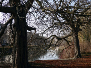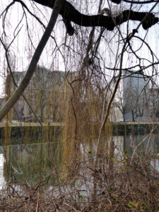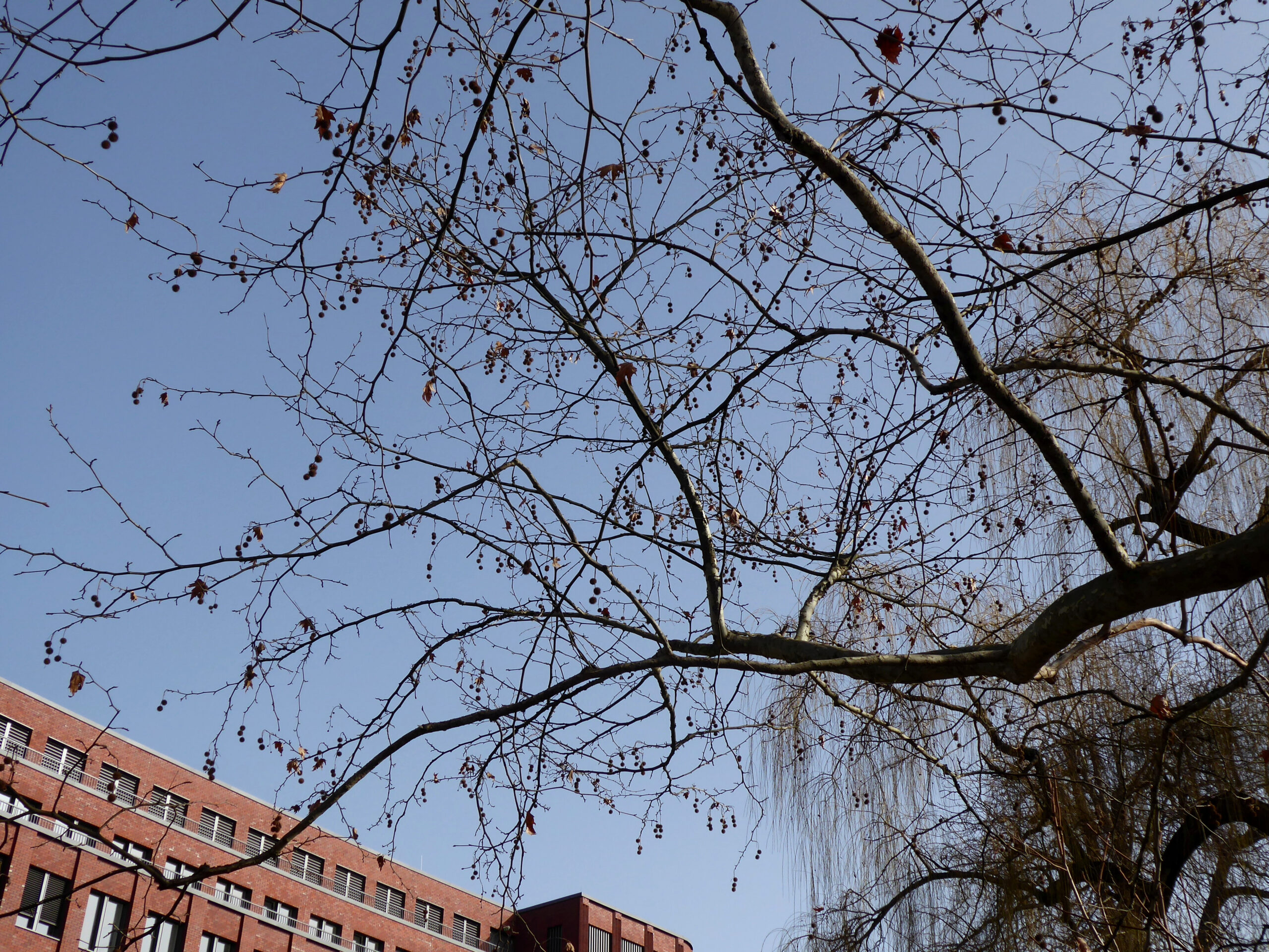 Weiter geht es auf dem Weg am Herkulesufer vorbei an Trauerweiden mit den allerersten grünen Spitzen an ihren weit ausladenden, senkrecht herabhängenden Ästen und alten Platanen, die noch die rauen, kugeligen Früchte des vergangenen Herbstes tragen.