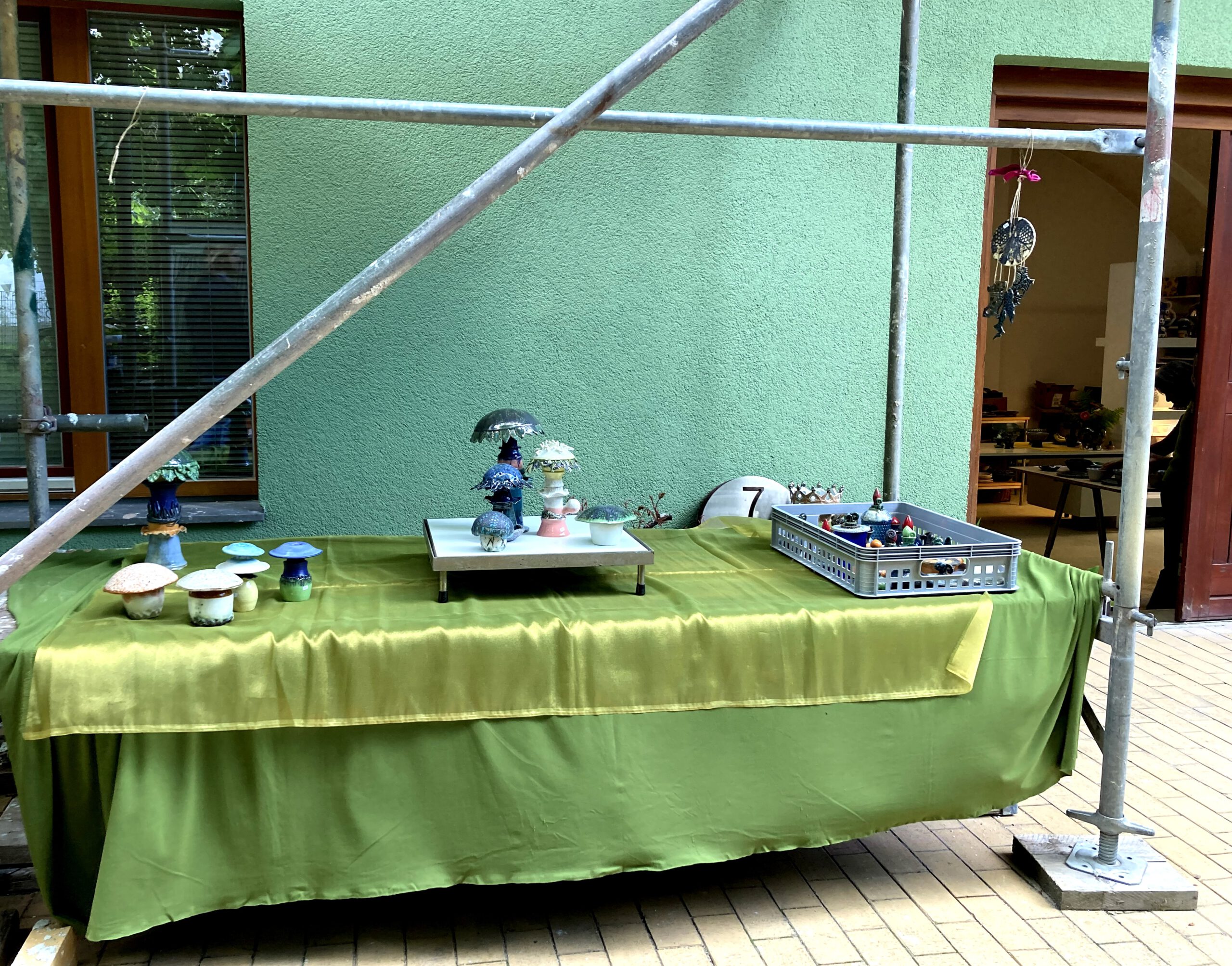 Evelyn Klam stellt in ihrer Keramikwerkstatt im Bogen 7 die neuesten Arbeiten vor. Am Morgen aus dem Brennofen genommen, direkt in die Regale und auf die Tische gestellt.