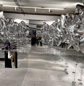 NOT A GALLERY feierte Freitag und Samstag die Mode mit „The VOGUE CLOSET“, das 45. Jubiläum von VOGUE Germany. Neben den besonderen Kleidungsstücken in der Ausstellung konnte eine Wand mit ganz persönlichen „Liebesbriefen an die Mode“ mitgestaltet werden. Der Raum dahinter war mit spiegelnden Flächen in schmale Gänge unterteilt und lud ein, zwischen silberfarbenen Herzluftballons selbst zu einem Teil der Installation zu werden. Eine Ausstellung die Spaß gemacht hat.