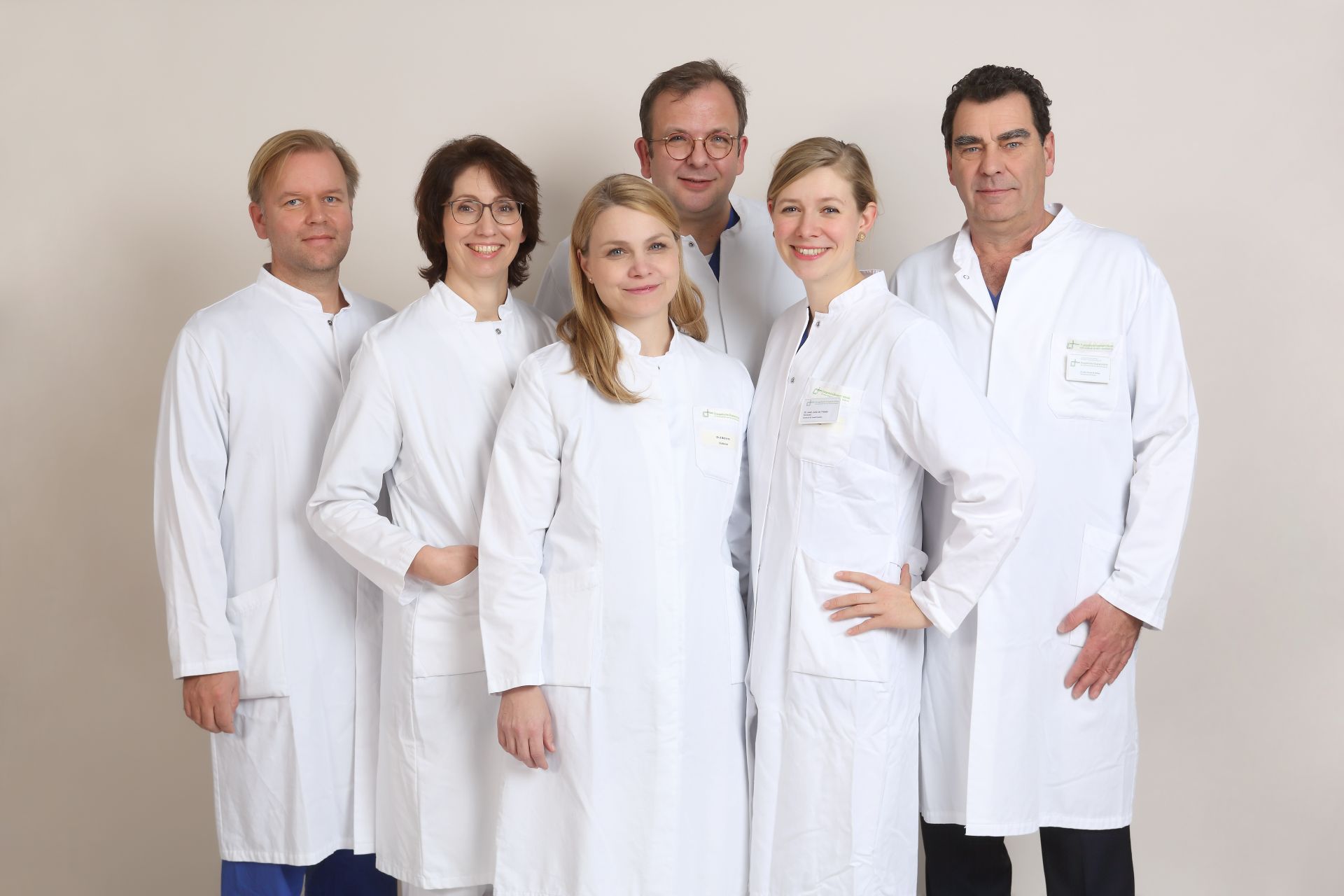 Das Team des Morbus Osler Zentrums Berlin mit den Chefärztinnen Dr. med. Vera Stiehr & Dr. med. Angelika Behrens (2 u. 3. von links) und Dr. med. Carsten Philipp (rechts), Leiter des Zentrums Lasermedizin.(Foto:Manuel Tennert)