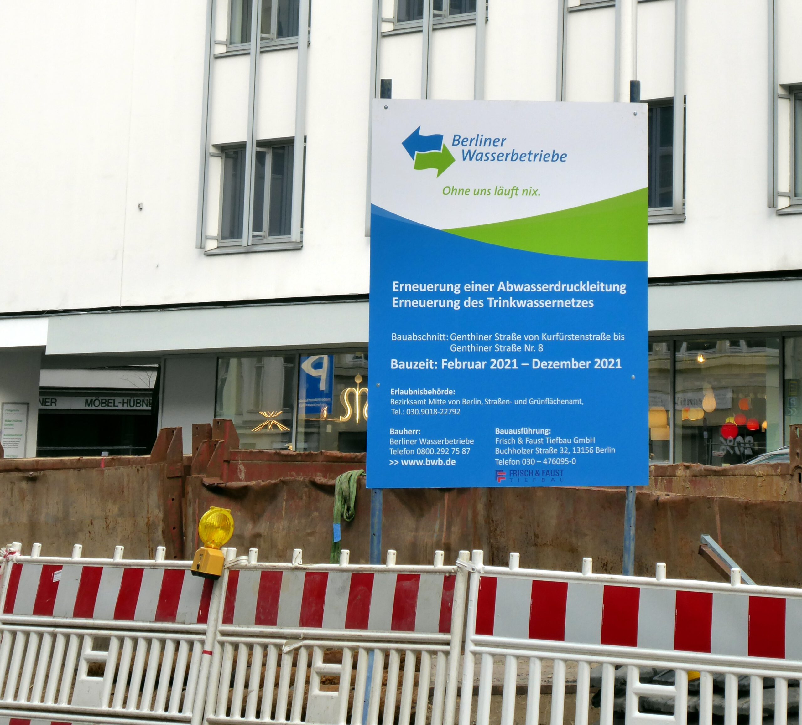 Die Bauzeit auf der Genthiner Straße wird noch bis Dezember 2021 andauern. Die Berliner Wasserbetriebe erneuern hier eine Abwasserdruckleitung und das Trinkwassernetz.