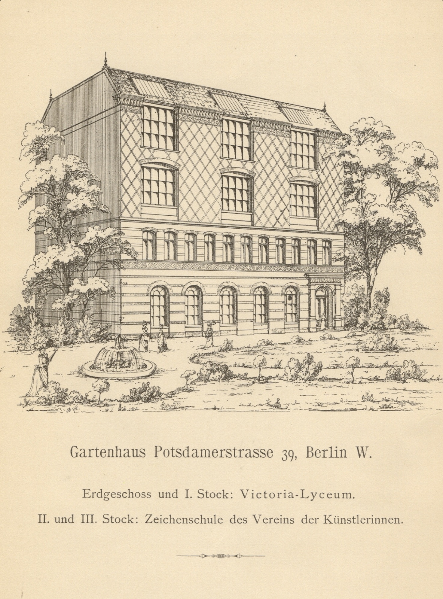 Erstmals im Berliner Adressbuch gelistet war sie 1870: Dlle. (Demoiselle = Fräulein) Archer, Direktorin des Victoria Lyceums, wohnte in der Bellevuestraße 26, neben dem königlichen Wilhelms-Gymnasium (Bild), einem reinen Jungengymnasium. Das Victoria-Lyceum, nicht zu verwechseln mit der Victoria-Schule, einer höheren Mädchenschule in Kreuzberg (Prinzenstraße), gab es da bereits, es war 1868 gegründet und im Januar 1869 eröffnet worden. Und auch das Victoria-Lyceum taucht 1870 im Adressbuch auf: Unterricht (Vorlesungen) fand im Hörsaal des Deutschen Gewerbe-Museums in der Stallstraße 7 statt (Bild 2), das nach der Weltausstellung 1867 in Paris mit Exponaten der Ausstellung in einem früheren Gebäude der Porzellanmanufaktur eingerichtet worden war. Für die nächsten 20 Jahre blieben die Unterrichtsveranstaltungen des Lyceums im Gewerbemuseums, aber 1893 erhielt das Victoria-Lyceum ein eigenes Schulgebäude in der Potsdamer Straße. Auch die Zeichenschule des Vereins Berliner Künstlerinnen und Kunstliebhaberinnen, gegründet 1867, war im Gewerbemuseum untergebracht und zog 1893 gemeinsam mit dem Lyceum in die Potsdamer Straße 39.
