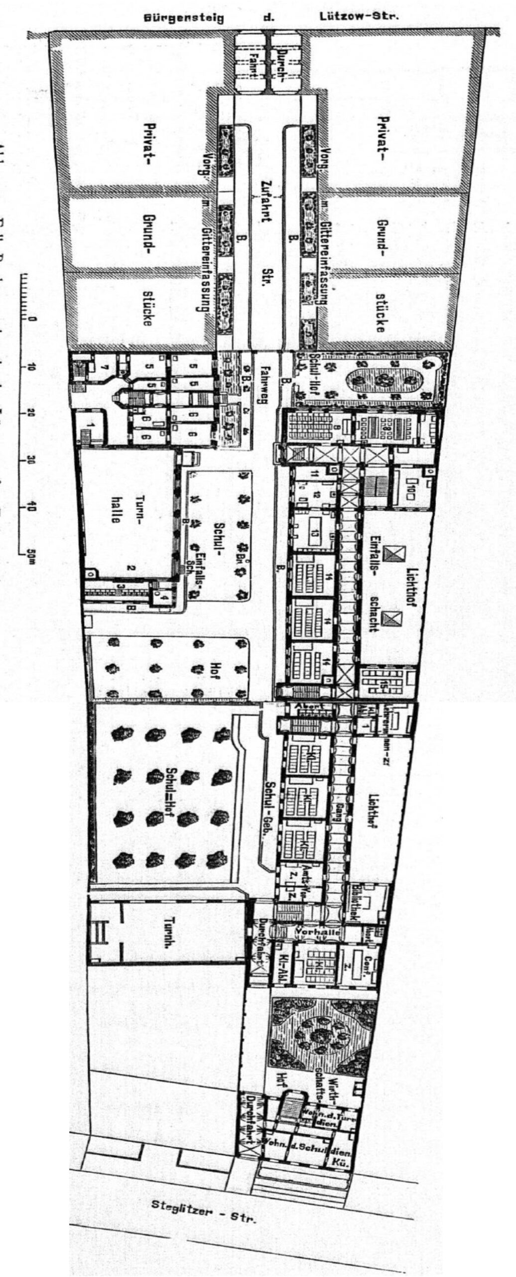 Auf dem langen Grundstück zwischen Lützowstraße und Steglitzer Straße (heute: Pohlstraße), an dessen einem Ende das Falk-Realgymnasium lag, war auf der anderen Seite (Steglitzer Straße 29) seit 1879 die Charlotten-Mädchenschule, die dritte Schule in diesem Block (Bild 3), durch eine hohe Mauer von der Jungenschule getrennt – Koedukation war noch ein Fremdwort. Im Jahre 1893 wurde die Mädchenschule zum Mädchen-Gymnasium, also zur ersten öffentlichen Mädchenschule, die auf das Studium vorbereitete – das Victoria-Lyceum war noch eine reine Privatschule gewesen. Dass dies innerhalb weniger Jahre passierte, war vor allem das Verdienst von Helene Lange (1848-1930), einer Politikerin, Pädagogin und Frauenrechtlerin der ersten Stunde, der wir ein eigenes Kapitel widmen wollen.