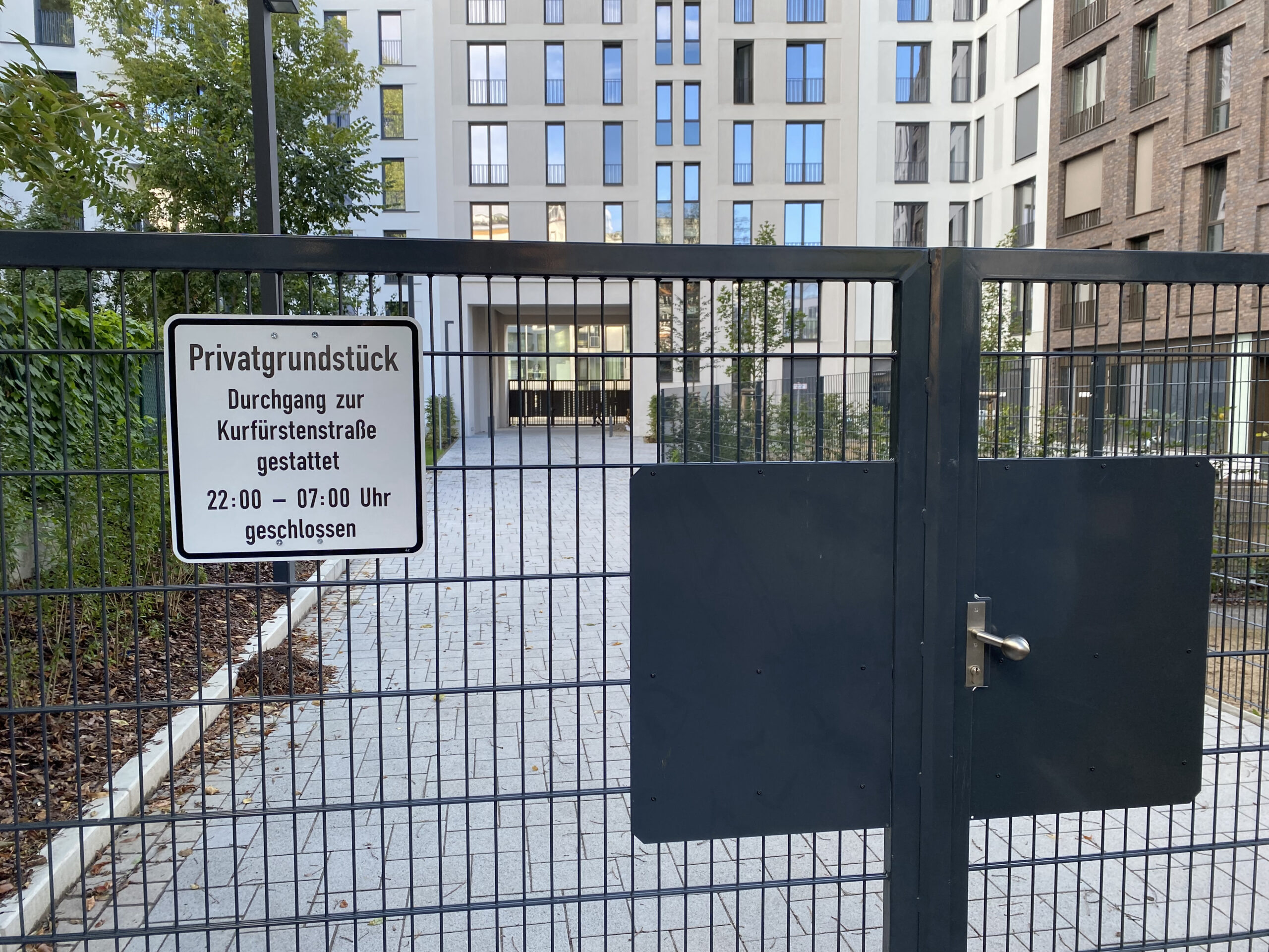 Die Eigentümer der neuen Wohnanlage „Schönegarten“ kommen damit einer Auflage der Baugenehmigung nach. Dort ist ein Wegerecht für eine öffentlich zugängliche Durchwegung eingetragen, die den Weg zum westlichen Eingang des U-Bahnhofs Kurfürstenstraße verkürzt.