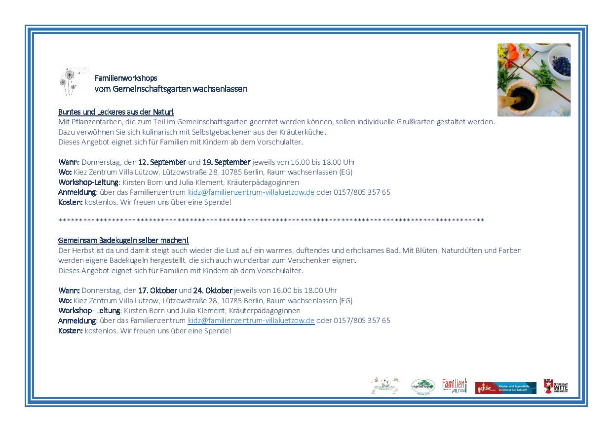 Familienworkshops in der Villa Lützow 5. September 2019Redaktion Hinterlassen Sie einen Kommentar Der Gemeinschaftsgarten „wachsenlassen“ bietet interessante Workshops für Familien mit Kindern ab dem Vorschulalter an: