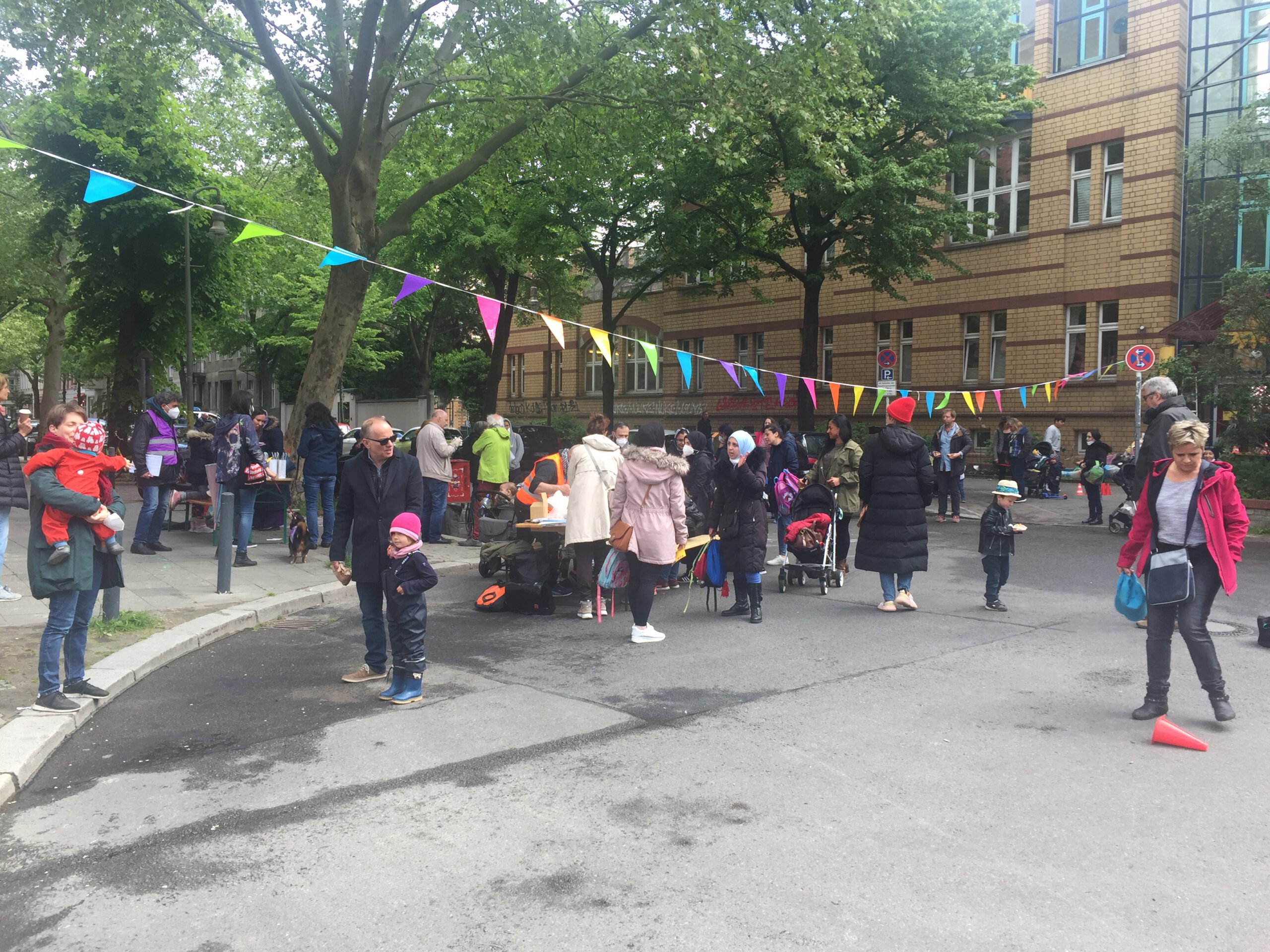 Am 27. Mai kamen trotz des sehr wechselhaften Wetters viele Kinder mit ihren Erzieherinnen und Eltern zu einem Spielfest der Nachbarn in die Pohl/Ecke Kluckstraße. Damit nahm Gabriele Hulitschke, Stadtteilverein Tiergarten Süd, die Initiative für eine Spielstraße und mehr Platz für Kinder vom letzten Jahr wieder auf.