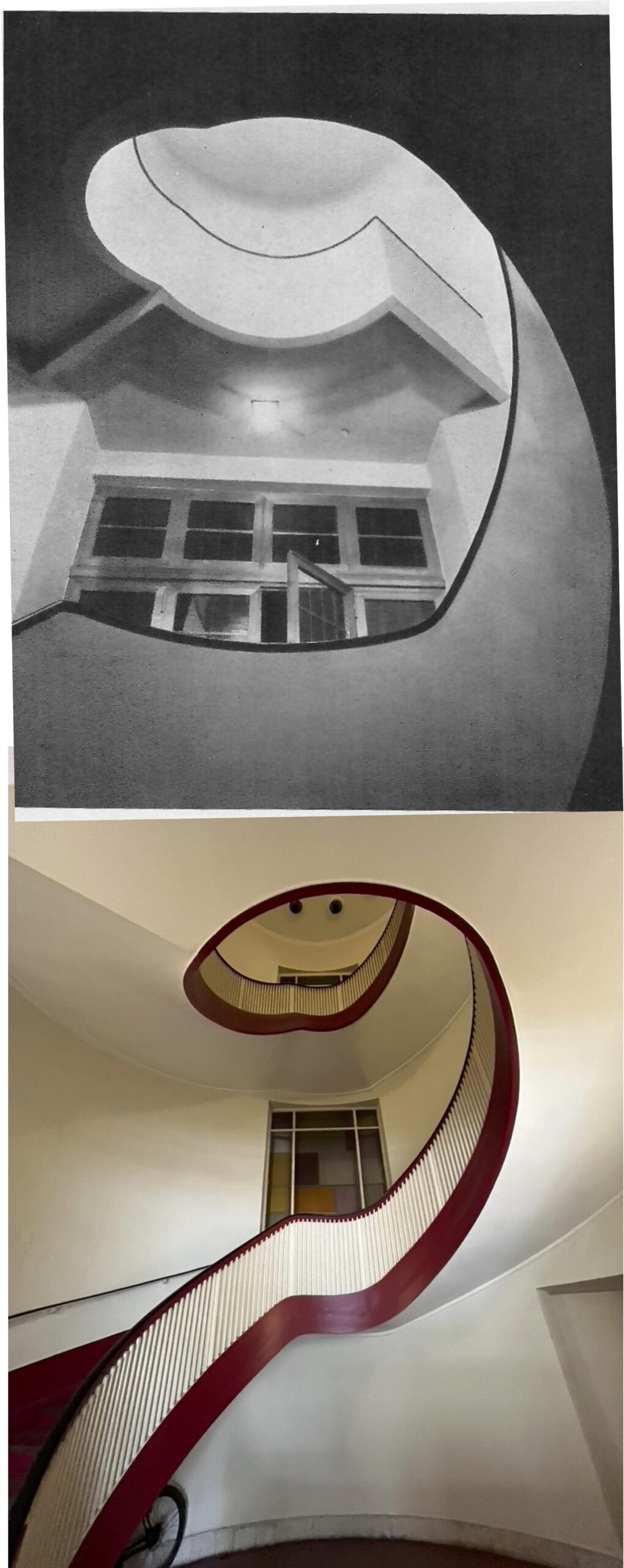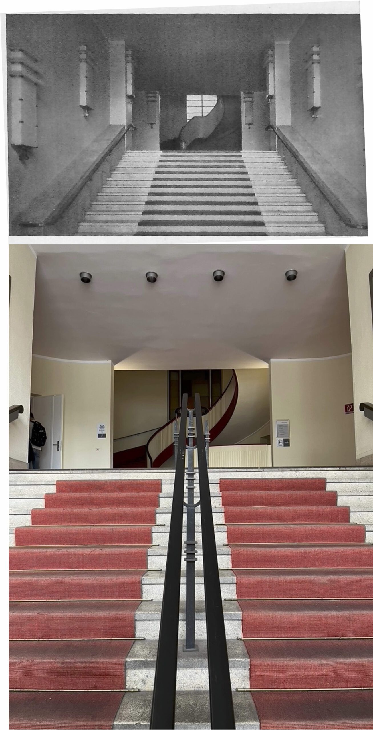 Also ging ich kurzentschlossen in das Haus und fand zu meinem Erstaunen unmittelbar hinter der Eingangstür das Treppenhaus in fast dem gleichen, eleganten Zustand wieder wie auf dem Foto von 1929 (Bild 2 und 3). Einige Details sind offensichtlich verändert, so z.B. hat die Eingangstreppe jetzt mittig ein Geländer, das es vorher nicht gab, auch ist unklar, ob die Farbgestaltung (rot und weiß, die Farben Preußens) im Original so war – vermutlich ja. Ähnliches hatte wir auch im Treppenhaus der Stiftung Warentest (mittendran vom 28. Februar 2024) gesehen.