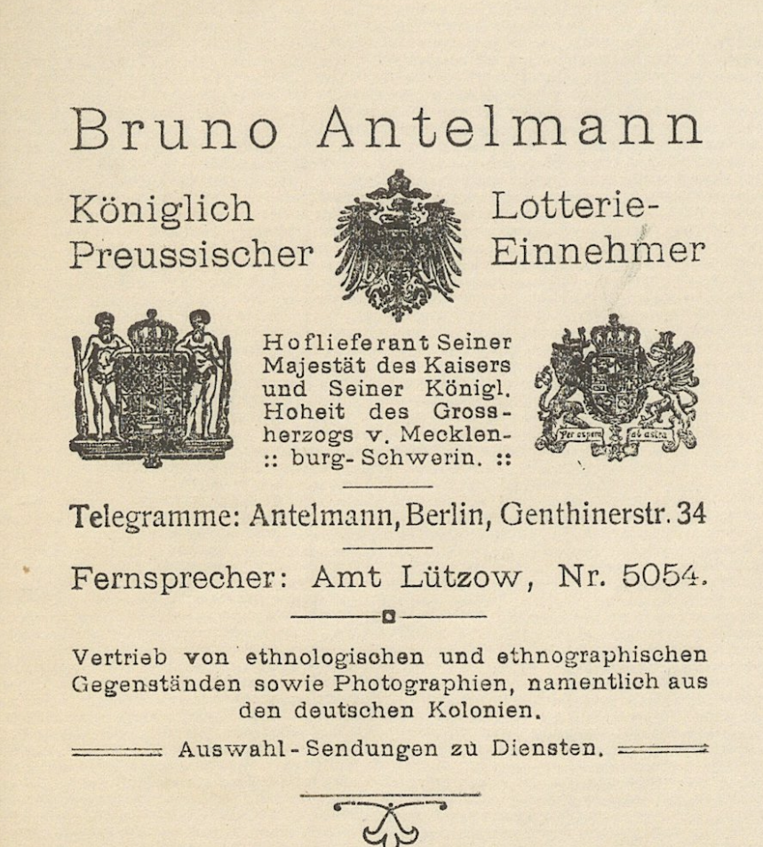 In der Kolonialzeitung gab es 1913 eine Kleinanzeige, wonach der Königlich-Preußische Lotterieeinnehmer Bruno Antelmann, mit Geschäft in der Genthiner Straße 34, ethnologische Gegenstände und Bücher vertriebt (Bild 9). Das Adressbuch 1913 nennt als Wohnadresse die Landauer Straße 8 in Wilmersdorf. Das Lotterielosgeschäft in der Genthiner Straße blieb bestehen, auch nach dem Tod von Bruno Antelmann, es wurde von seiner Witwe weitergeführt. Bruno Antelmann verstarb am 2. Juli 1926, als letzte Wohnadresse ist Strausberg angegeben; seine Frau Martha starb nur wenige Jahre später, am 6. April 1929, auch hier ist die letzte Adresse Straußberg, Kaiserstraße 6. Beide sind in der Familiengruft der Familie Kühn auf dem Alten 12-Apostel-Friedhof in Schöneberg beigesetzt.