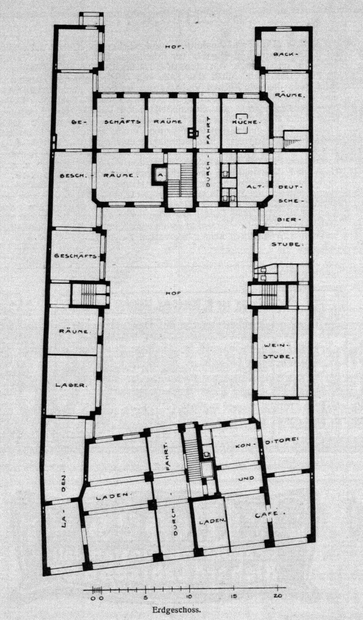 Bild 5: Grundfläche im Erdgeschoss des Kolonialhauses, ca. 450 qm. Das ganze Haus hatte 1800 qm Nutzfläche und hatte 500 Mark/qm gekostet, insgesamt 900.000 Mark (Quelle: Blätter für Architektur und Kunsthandwerk 18. Jahrgang, 1905, Nr. 4, S. 26-27).