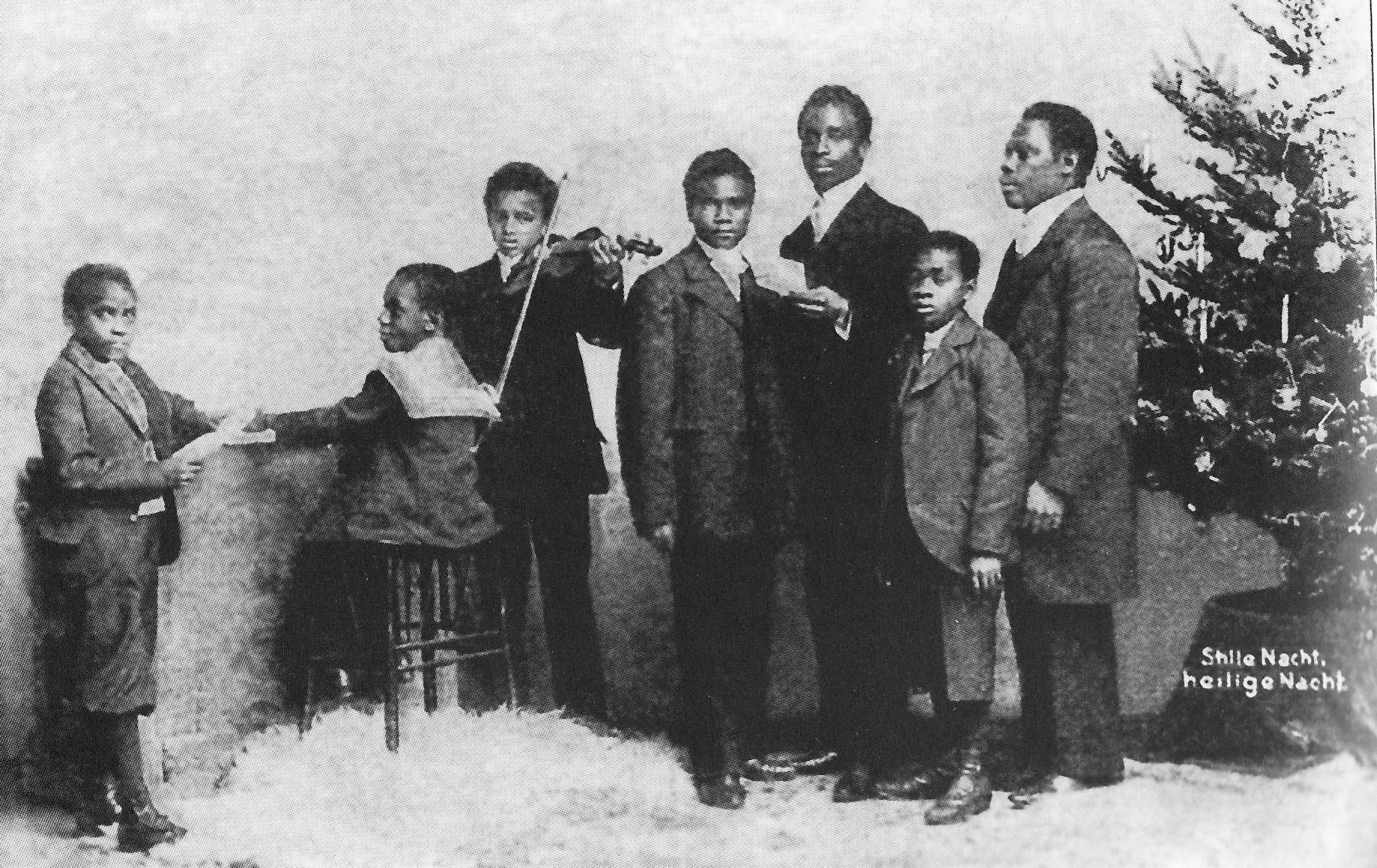 Bild 6: Die farbigen Angestellten der Familie Antelmann. Der Junge am Harmonium ist Quassi Bruce, eines der beiden Pflegekinder (Quelle: Deutsche Kolonialzeitung vom 9. Januar 1902, S.16)