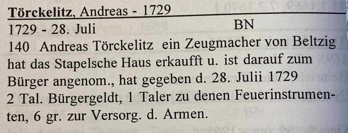 Bild 1. Eintrag Törckelitz im Bürgerbuch für 1729 (Kopie aus der Transkription der Bürgerbücher-Karteikarten von E.Haug durch H.Quadbeck im Jahr 1998) (Domstiftsarchiv, Signatur: NLH 8 und 10).