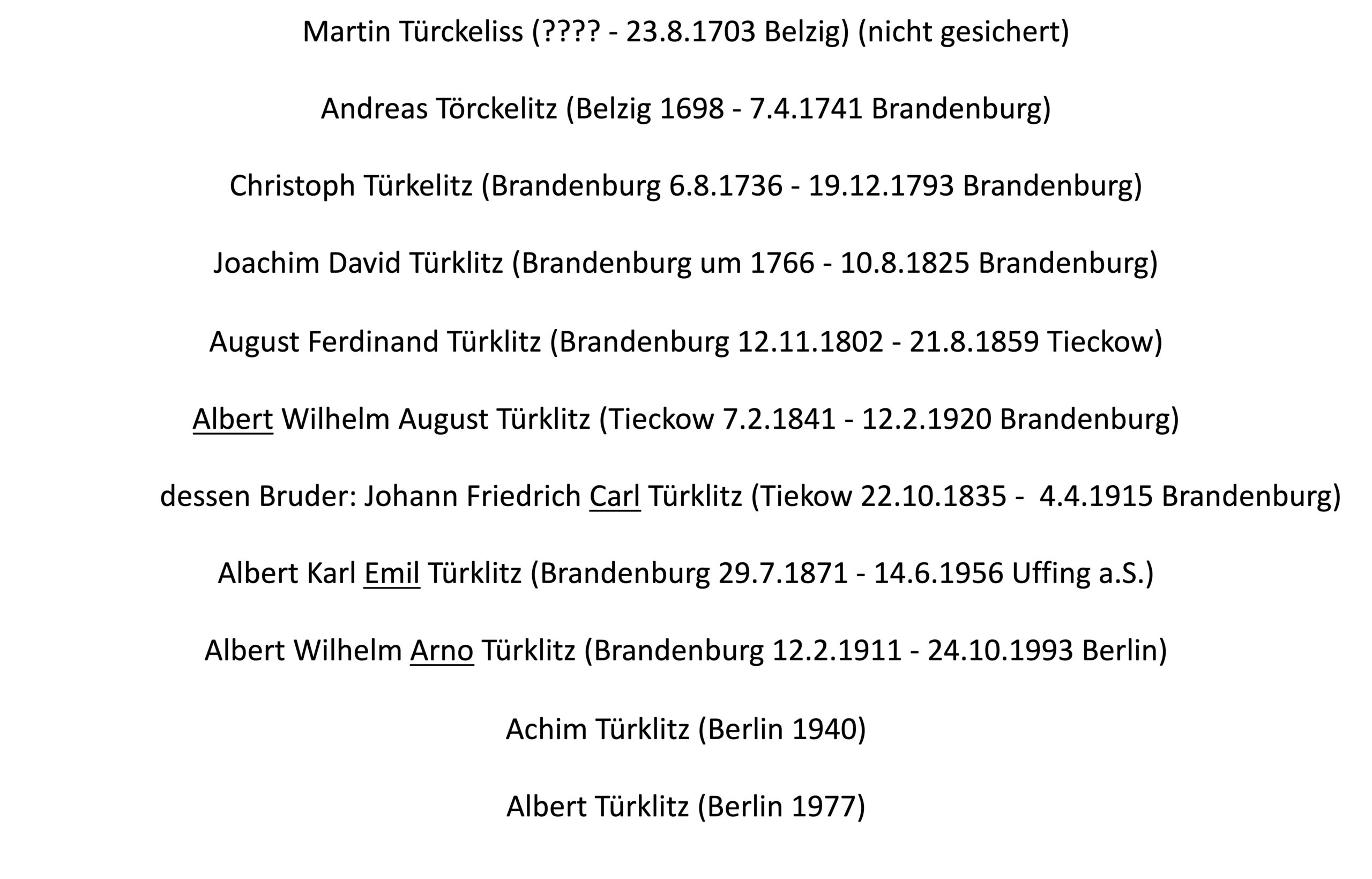 Bild 2. Die Familie Türklitz aus Brandenburg (Havel), wie sie sich auch unserer Rekonstruktion darstellt. Hier sind nur die jeweils männlichen Nachkommen, die die Generationenfolge sichern, dargestellt, nicht alle Geschwister der jeweiligen Generation. Man beachte die unterschiedlichen Schreibweisen des Nachnamens in früheren Zeiten.