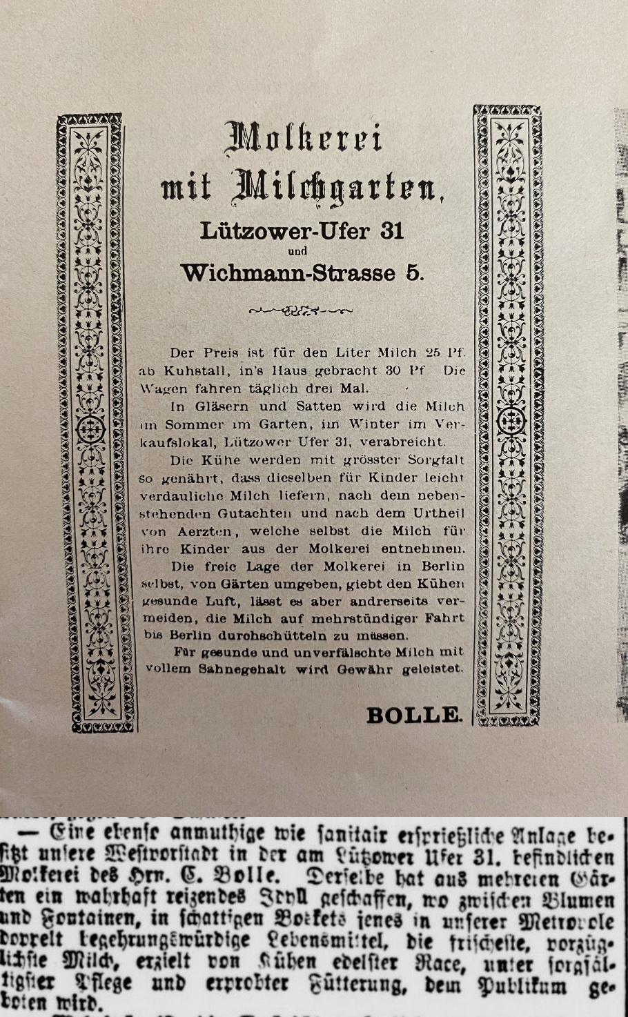 Bild 2: Anzeige des Milch- und Gartenrestaurants Bolle am Lützowufer 31 und Notiz in der Voss´schen Zeitung vom 12. Mai 1880 (Abendausgabe).