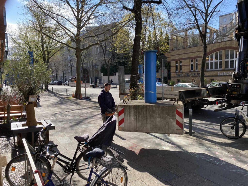 Seit ein paar Tagen werden auf den Gehwegen in Tiergarten Süd blaue Rohre verlegt. Durch sie wird das Grundwasser von einer Baustelle in Schöneberg Nord zum Landwehrkanal gepumpt.
