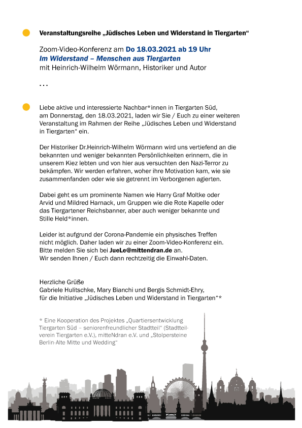 Der Historiker Dr.Heinrich-Wilhelm Wörmann wird uns vertiefend an die bekannten und weniger bekannten Persönlichkeiten erinnern, die in unserem Kiez lebten und von hier aus versuchten den Nazi-Terror zu bekämpfen. Wir werden erfahren, woher ihre Motivation kam, wie sie zusammenfanden oder wie sie getrennt im Verborgenen agierten. Dabei geht es um prominente Namen wie Harry Graf Moltke oder Arvid und Mildred Harnack, um Gruppen wie die Rote Kapelle oder das Tiergartener Reichsbanner aber auch weniger bekannte und Stille Held*innen.