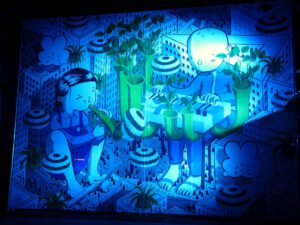 Den Eingang der Potsdamer Platz Arkaden verwandelt der Street Artist Milo „Nach allem, gibt es noch etwas“, die die Wiedergeburt eines Stadtviertels zeigt.