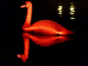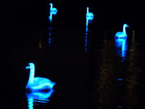 Auf dem Piano-See wird das Märchen „Die wilden Schwäne“ von Christian Andersen lebendig. Elektronische Schwäne tanzen und leuchten hell auf dem Wasser. Eine Installation von Denis Bivour & Florian Giefer (Loomaland.com) erstellt und produziert.