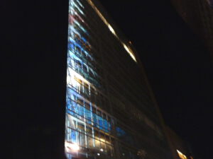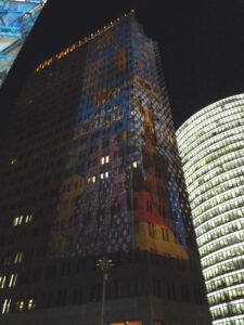 Die Projektionen auf die Fassaden des Kollhoff-Tower und Forum Tower kombinieren eine riesige Kunst-Collage zum Thema 30 Jahre Deutsch Einheit, Zusammenhalt und Zusammengehörigkeit der Künstler Thierry Noir, Bouchet oder Ciddy.