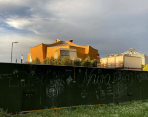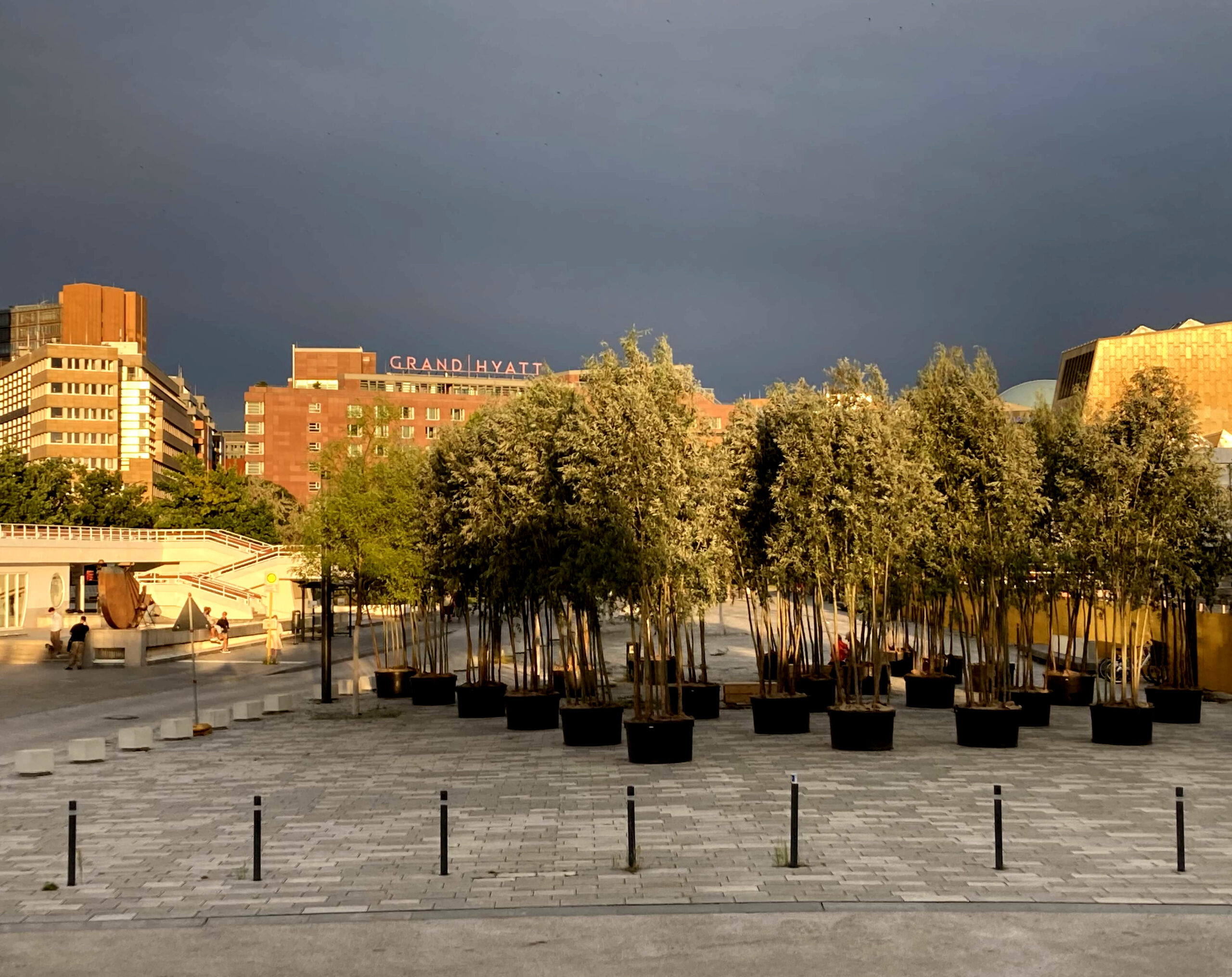 In der seit Ende Mai 2023 neu entstandenen, temporären Freirauminstallation stehen heimische- und nicht heimische Baumarten auf der Piazzetta des Kulturforums vor dem Café Estrade, auf dem davor gelegenen Scharounplatz und demnächst auch auf dem grünen Rondell der St. Matthäus-Kirche.