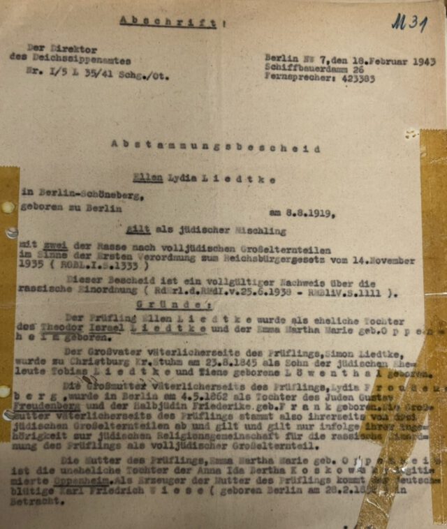 Theodor Liedtke, 1887 in Berlin als einziger Sohn jüdischer Eltern, Schier (Simon) Liedtke und dessen Ehefrau Lydia Freudenberg, geboren, hatte am 14. August 1915 die Emma Martha Oppenheim geheiratet, die 1892 in Berlin zur Welt kam – Emma war ohne Beruf und uneheliches Kind der Näherin Anna Oppenheim (1892-1949). Wir können davon ausgehen, dass diese im Krieg geschlossene Ehe in einem Heimaturlaub des Soldaten Theodor Liedtke stattfand. Ihr einziges Kind, ihre Tochter Ellen, kam erst nach dem Krieg zur Welt, am 8. August 1919. Als Ellen 25 Jahre alt war, starb ihre Mutter Emma am 21. Dezember 1934 im St. Norbert-Krankenhaus in Schöneberg im Alter von nur 42 Jahren. Ob sie angesichts und in Folge der zunehmenden Verfolgung jüdischer Familien starb oder an einer tödlichen Erkrankung ergibt sich aus den Unterlagen nicht. Sie selbst hatte als Halbjüdin einen arischen Vater, wie eine Abstammungsurkunde für ihre Tochter Ellen aus dem Jahr 1943 belegt (Bild 3).