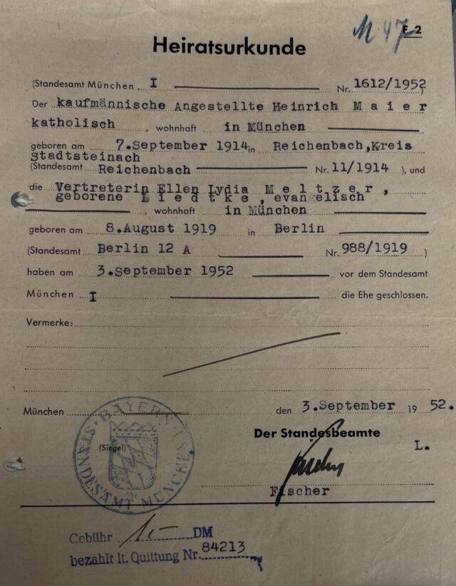 Bild 6: Heiratsurkunde der Ellen Meltzer geborene Liedtke mit Heinrich Maier 1952 (aus: 2).