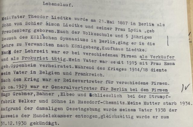 In der Entschädigungsakte im Landesamt für Besoldung (2), die seine Tochter Ellen 1956 veranlasst hatte (s. unten), fand sich ein Lebenslauf von Theo 2 aus der Sicht seiner einzigen Tochter Ellen, die bis zu seiner Verhaftung 1941 mit ihm zusammen wohnte. Dieser Lebenslauf ist die bislang ausführlichste Dokumentation seines beruflichen und privaten Lebens (Bild 1). Er bestätigt Abwesenheit von Berlin aus beruflichen Gründen ebenso wie eine Zeit im Militärdienst.