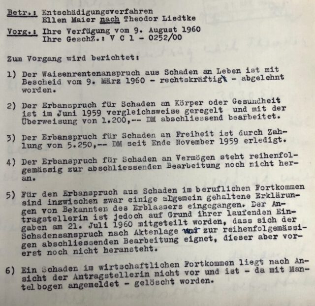 Sechs Jahre nach Erstantrag berichtete das Entschädigungsamt dem Senator des Inneren in Berlin, dass von den sechs gestellten Anträgen (Bild 7) der Antrag auf Waisengeld abgelehnt wurde, der Antrag auf Schaden im wirtschaftlichen Vorkommen zurückgezogen wurde, ein Antrag auf Schaden an Körper und Gesundheit mittels Vergleich beendet wurden (Entschädigung: 1200 DM), ein Antrag auf Schaden an Freiheit (ihres Vaters) durch Zahlung von 5250 DM beglichen wurde, und zwei Anträge (Schaden an Vermögen, Schaden an beruflichem Fortkommen) noch in Bearbeitung seien. Der Vermögensschaden wurde 1963 mit 4800 DM entschädigt, der Antrag auf Schaden an beruflichem Fortkommen wurde zunächst ablehnt, 1968 aber in einem weiteren Vergleich mit 8075 DM beziffert und bezahlt.