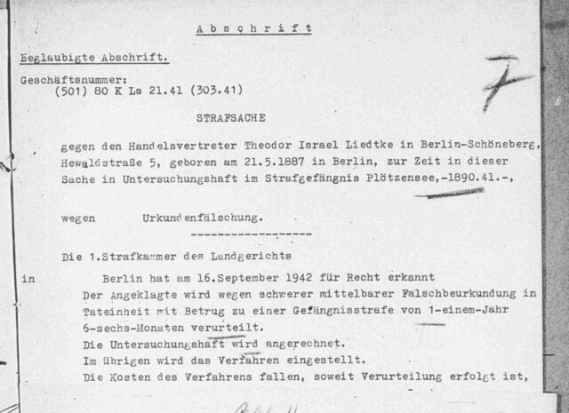 Bei diesem Gerichtsverfahren ging es um zwei Tatbestände: Theodor Liedtke hatte sich gegenüber einem Notar im Mai 1940 als Halbjude ausgegeben, eine Kennkarte als Jude nicht beantragt, mithin auch nicht vorgelegt, und hatte sich bislang geweigert, den Zwangsvornamen „Israel“ zu führen und den Judenstern zu tragen. Stattdessen hatte er in mehreren Eingaben seit 1938 versucht, eine Bestätigung als Halbjude zu bekommen, was polizeilich abgelehnt worden war. Und zum anderen hatte er bei eben diesem Notar die Umschreibung (Schenkung) seines Viertel-Anteils an einem Grundstück in Schöneberg (Büsingstrasse 14/Odenwaldstr. 26), das er und seine Tochter Ellen von seiner Frau geerbt hatte, auf seine Tochter zwecks Vermögenssicherung veranlasst. Nachdem dies bereits erfolgt war, hatte der Bezirksbürgermeister gegen diese Umschreibung Widerspruch eingelegt und so den Zugriff des nationalsozialistischen Staates auf das Vermögen der Juden sichergestellt. Theodor Liedtke kam im Dezember 1941 in Untersuchungshaft in das Gefängnis Plötzensee in Berlin-Tegel.