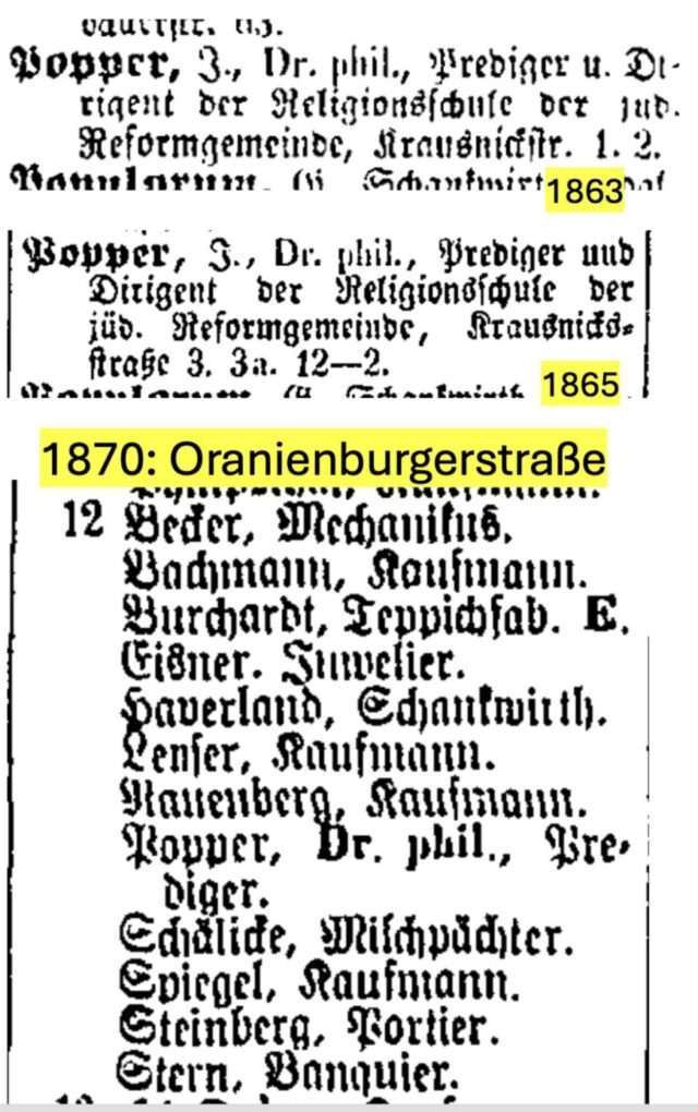 Den Eindruck eines gutbürgerlichen Hauses mit solventen, wenngleich sicherlich nicht reichen Mietern gewinnt man auch bei Durchsicht der Bewohner des Hauses Krausnickstraße 16 im Adressbuch Berlins für die Jahre 1872 und 1873: es handelt sich um den einen oder anderen Fabrikanten, aber vorwiegend um Kaufleute. Julius Popper war allerdings der einzige akademisch gebildete Bewohner des Hauses, und auch die übrigen Häuser der Straße hatten wenige Beamte und Akademiker.